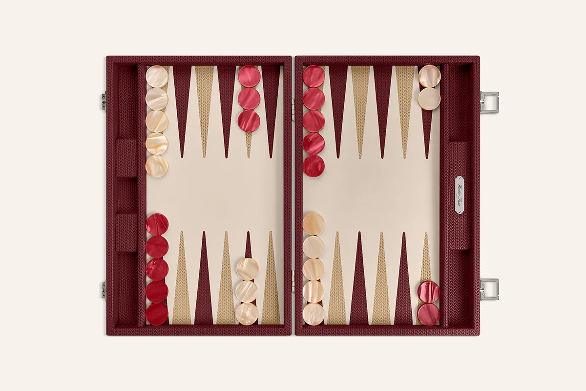 La précision du motif Chaîne, l'élégance du cuir. Le cuir impression Chaîne apporte relief et caractère à ce backgammon. Fidèle au savoir-faire de la Maison Hector Saxe, il conjugue esthétique affirmée et plaisir du jeu.