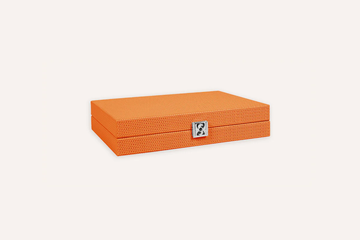 La précision du motif Chaîne, l'élégance du cuir. Le cuir impression Chaîne apporte relief et caractère à ce backgammon. Fidèle au savoir-faire de la Maison Hector Saxe, il conjugue esthétique affirmée et plaisir du jeu.