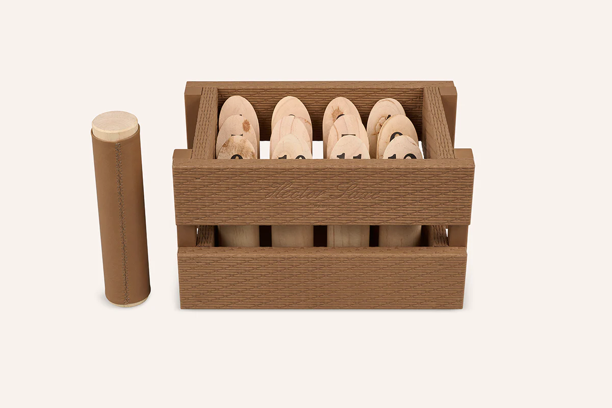 Fidèle à son esprit visionnaire, la Maison Hector Saxe dévoile "Jeux de Saison", une collection de jeux dédiés à l’extérieur. Pensée pour le jardin et la terrasse, elle célèbre le jeu comme un moment de partage et d’évasion. Le Jeu de Quilles Finlandaises s’y distingue par son cuir tressé et son allure singulière, conçu comme un objet de caractère autant que de jeu.