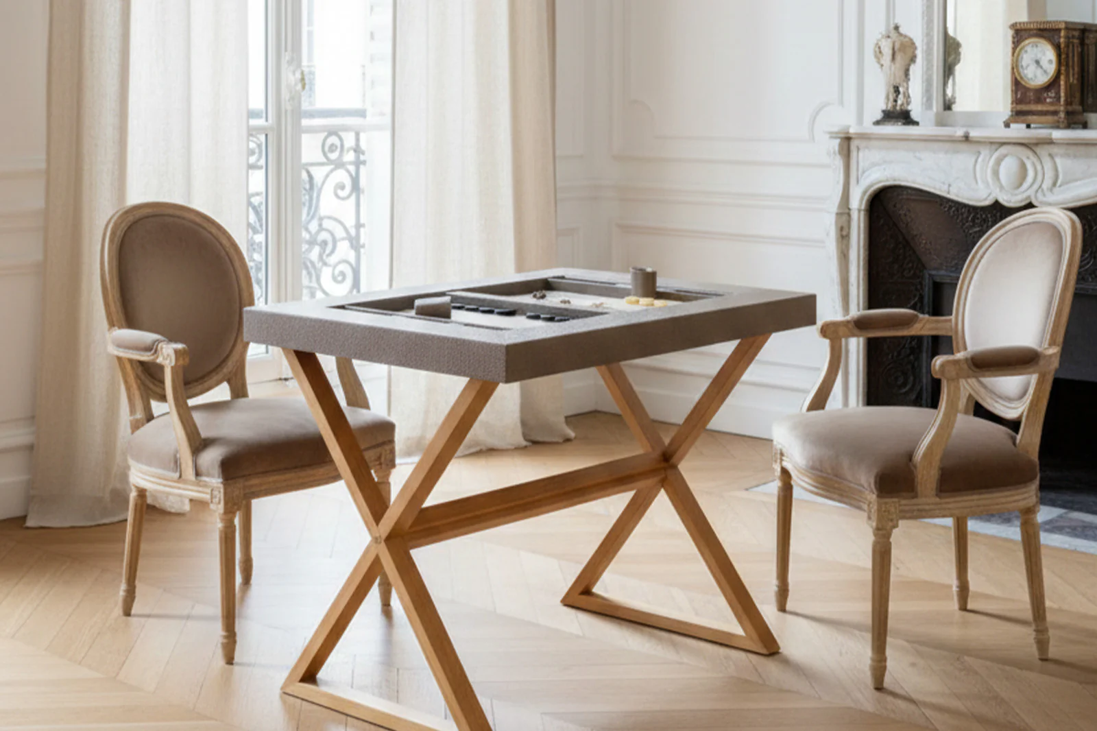 La Table de Backgammon Hector Saxe allie savoir-faire artisanal et élégance contemporaine. Véritable pièce décorative, elle est réalisée sur demande et se décline dans toutes les couleurs de cuir grainé au choix.